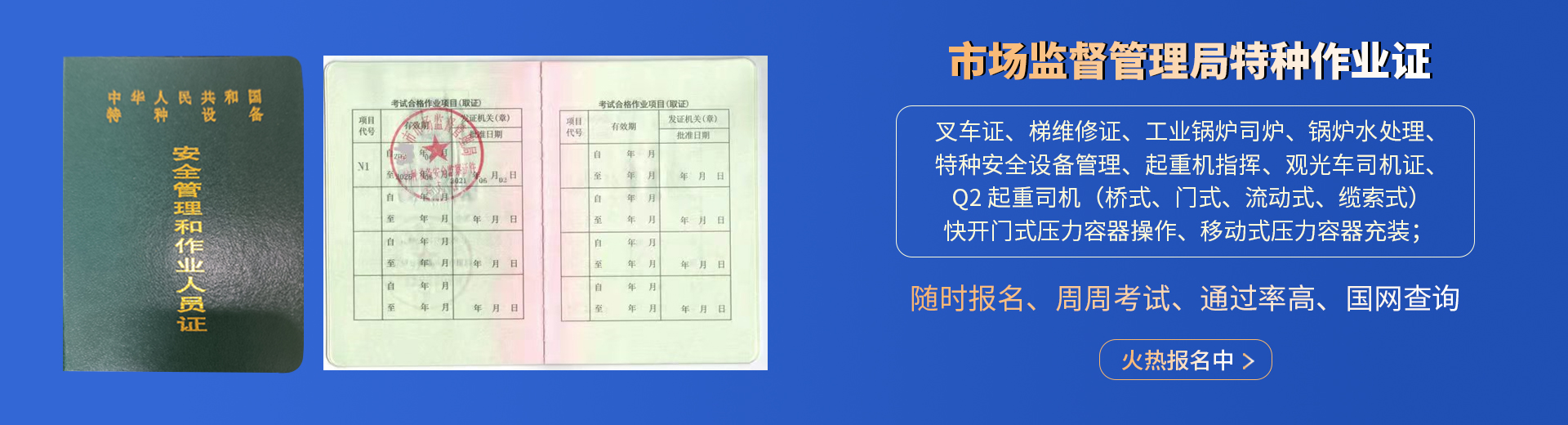 叉車證,電梯維修證,起重司機(jī)-橋式-門(mén)式-流動(dòng)式,起重指揮,壓力容器操作,鍋爐司爐,水處理,特種設(shè)備管理,觀光車;